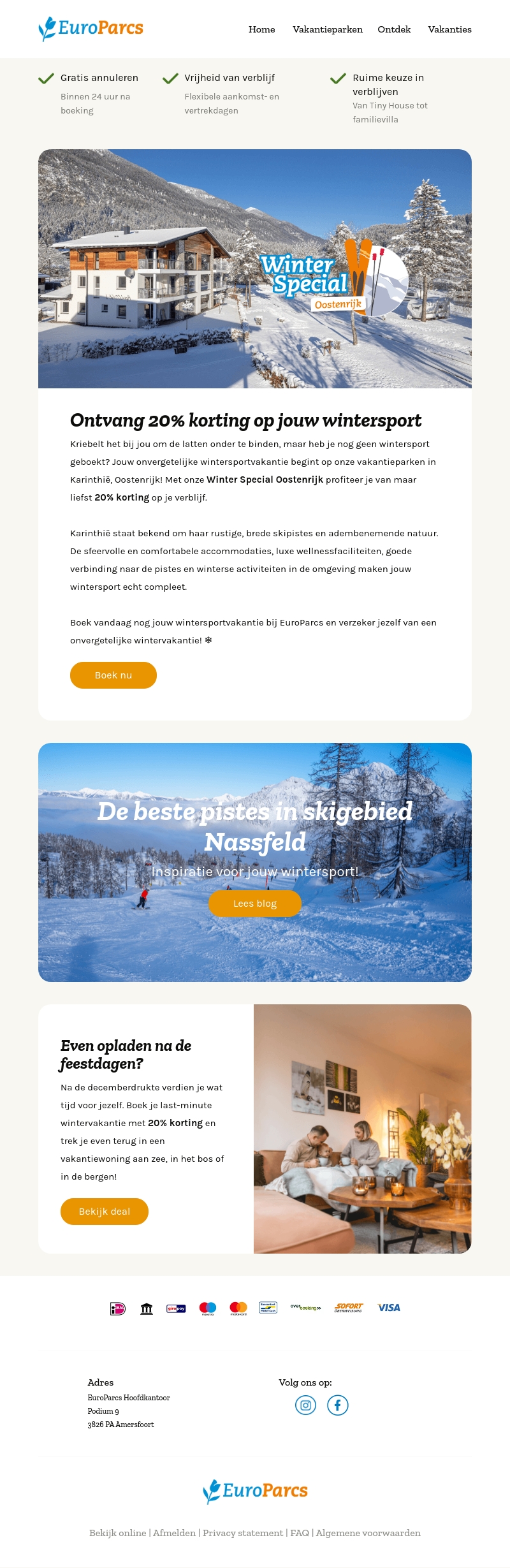 Beleef een onvergetelijke winter met EuroParcs. Ontvang nu 20% korting op je wintersportvakantie in de prachtige regio's van Karinthië of Nassfeld. Geniet van comfortabele accommodaties, luxe wellnessfaciliteiten en een adembenemende natuur. Boek vandaag nog je winteruitje en verzeker jezelf van een unieke ervaring.