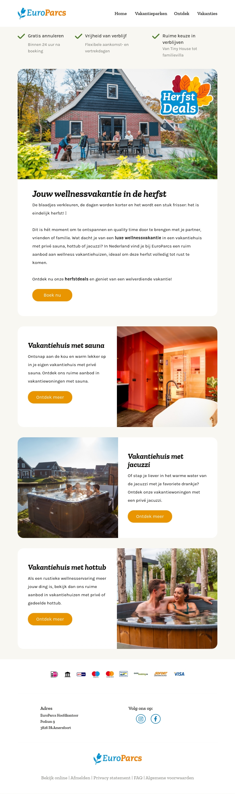 De herfst is het perfecte moment om te genieten van een ontspannende wellnessvakantie. Boek nu een verblijf in een van onze luxe vakantiewoningen, voorzien van privΓ© sauna, jacuzzi of hottub, en ontvang 20% korting. EuroParcs biedt een breed scala aan accommodaties voor ultieme ontspanning. Ontsnap aan de dagelijkse hectiek en kom volledig tot rust. Profiteer tijdelijk van onze herfstdeals.