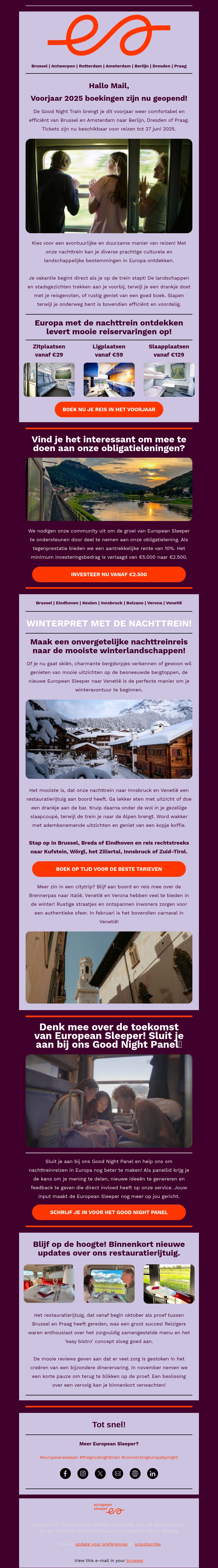 De boekingen voor voorjaar 2025 zijn nu geopend bij European Sleeper. Ontdek comfortabele en efficiënte treinreizen naar Berlijn, Dresden en Praag. Geniet van een ontspannen reiservaring en reserveer je zit-, lig- of slaapplaatsen vanaf slechts €29. Mis de kans niet om prachtige Europese steden te ontdekken.