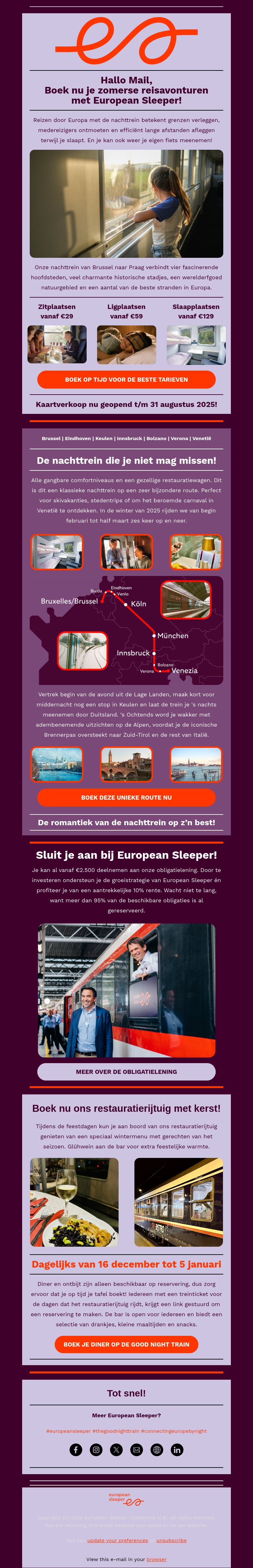 Reis deze zomer comfortabel met de Europese Sleeper en profiteer van aantrekkelijke tarieven. Boek nu je nachtelijke avonturen door Europa en bezoek charmante steden met gemak. Onze treinroutes bieden een unieke ervaring waar je kunt ontspannen en genieten van de natuur. Mis de kans niet om deze zomer voordelig te reizen en prachtige plekken te ontdekken.