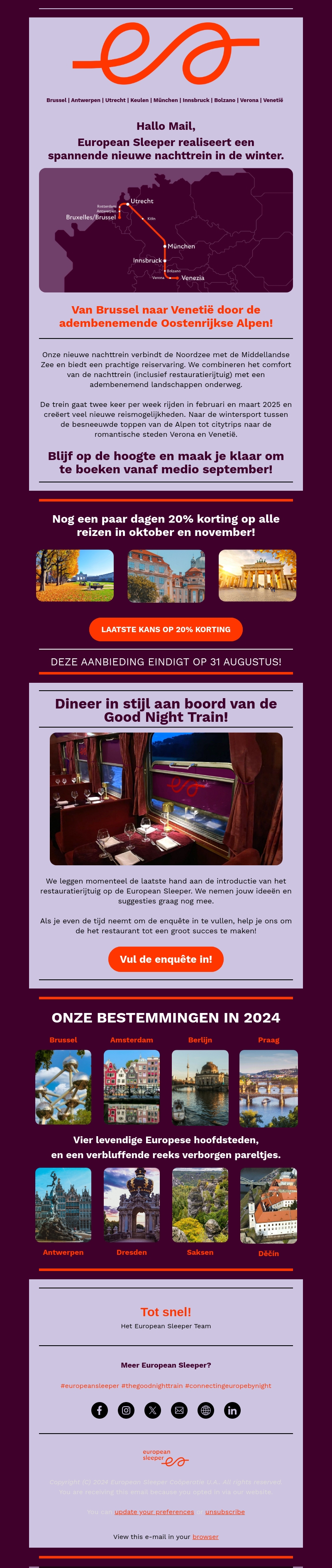 European Sleeper introduceert een spannende nieuwe nachttrein voor de winter. De trein rijdt van Brussel naar Venetië via de adembenemende Oostenrijkse Alpen. Geniet van 20% korting bij boeking in oktober en november!