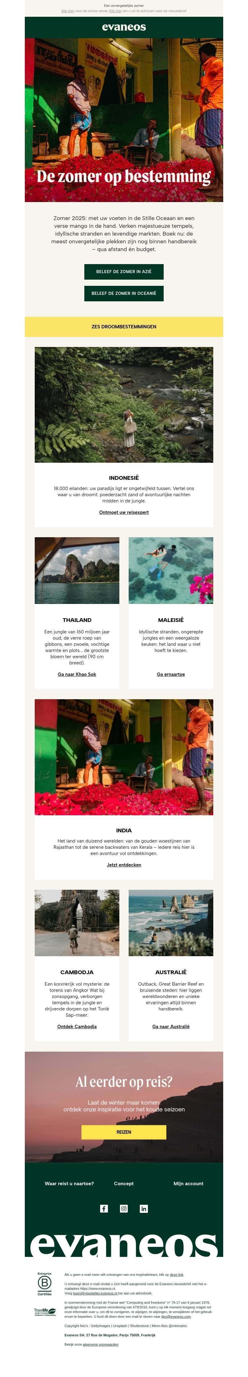 Verken de zomer met Evaneos! Duik in adembenemende bestemmingen zoals Indonesië, Thailand en Australië. Ontdek majestueuze tempels, idyllische stranden en levendige markten. Boek nu om je droomreis werkelijkheid te maken. Laat de avonturen beginnen!