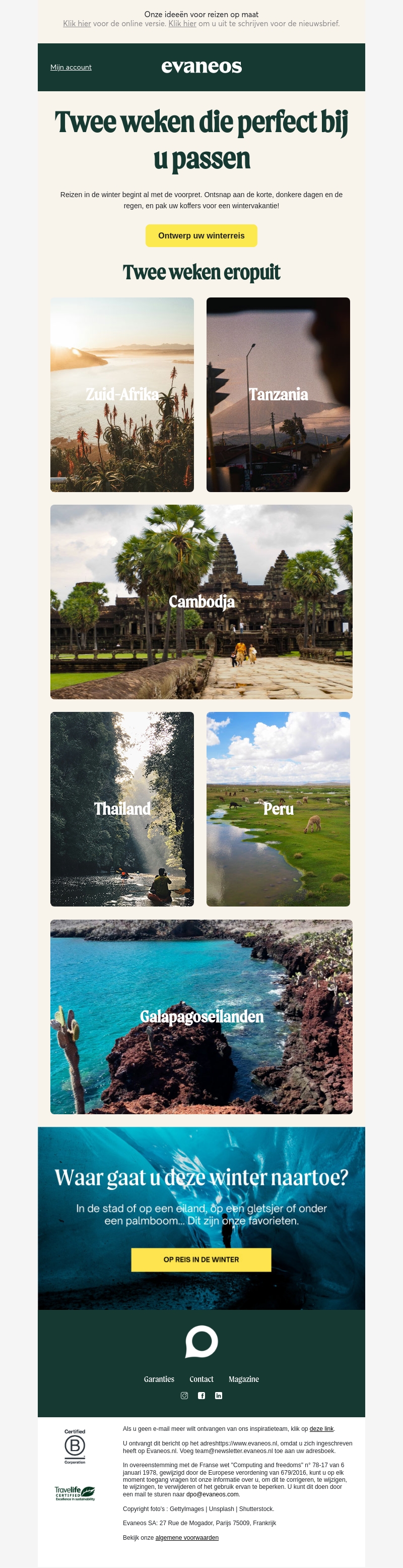 Evaneos biedt op maat gemaakte reiservaringen voor de winter. Ontsnap aan de kou en verken bestemmingen zoals Zuid-Afrika, Tanzania, Cambodja, Thailand, Peru en de Galapagoseilanden. Plan uw perfecte twee weken weg van de winterse regen en donkere dagen. Ontwerp nu uw unieke winterreis en ontdek nieuwe horizonten.