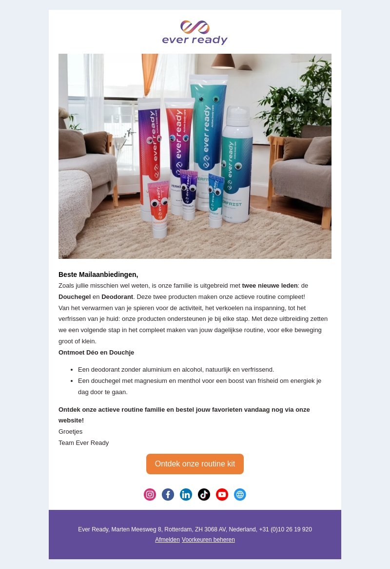 Ever Ready breidt zijn productlijn uit met twee nieuwe producten: deodorant en douchegel. Deze essentials zorgen voor verfrissing en energie in je dagelijkse routine. Alle producten zijn vrij van aluminium en alcohol, en bieden een boost van menthol en magnesium. Ideaal voor iedereen die houdt van een actieve levensstijl. Bestel vandaag nog via onze website.
