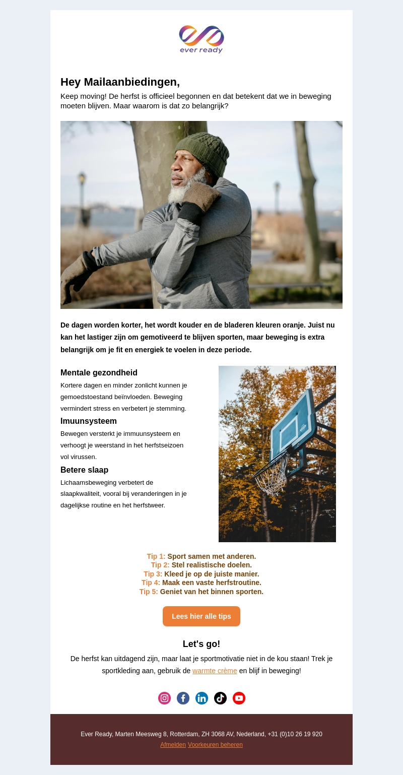 De herfst is aangebroken en de dagen worden korter en kouder. Het is nu belangrijker dan ooit om actief te blijven voor je gezondheid. In deze nieuwsbrief lees je waarom beweging essentieel is voor je mentale gezondheid, immuunsysteem en slaap. Ontdek vijf praktische tips om gemotiveerd te blijven sporten, zelfs tijdens de koudere maanden.