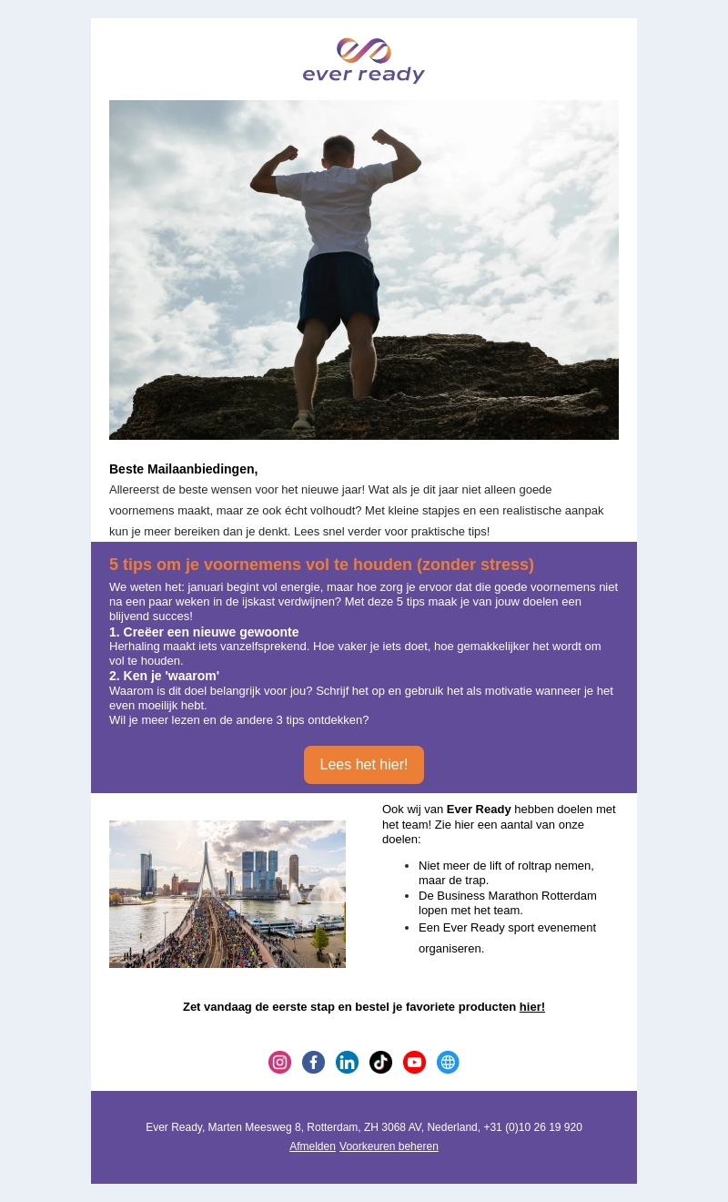 Begin het nieuwe jaar met energie en volharding! Ontdek met Ever Ready hoe je vijf onmisbare tips kunt toepassen om je goede voornemens succesvol te maken. Lees meer over het creëren van nieuwe gewoonten en het begrijpen van je 'waarom'. Zet de eerste stap naar succes!