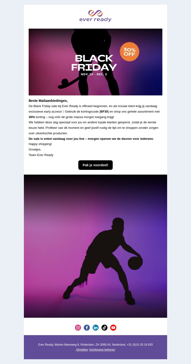 De Black Friday sale bij Ever Ready is begonnen! Ontvang exclusieve vroege toegang en geniet van 30% korting op ons volledige assortiment. Profiteer van de eerste keuze en shop zonder stress. Alleen vandaag beschikbaar voordat de deuren voor iedereen open gaan!