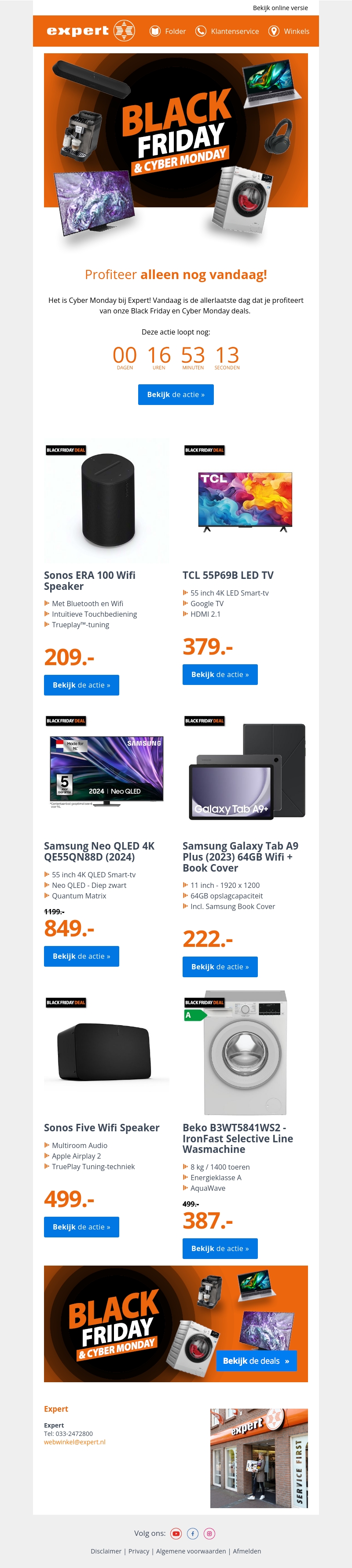 Grijp je kans op de ultieme Black Friday aanbiedingen bij Expert. Vandaag is de laatste dag om te profiteren van scherpe kortingen op topmerken zoals Samsung, TCL, Sonos en meer. Mis niet de exclusieve deals op tv's, speakers, tablets en wasmachines. De tijd tikt, dus zorg dat je op tijd bent om de beste aanbiedingen binnen te halen!