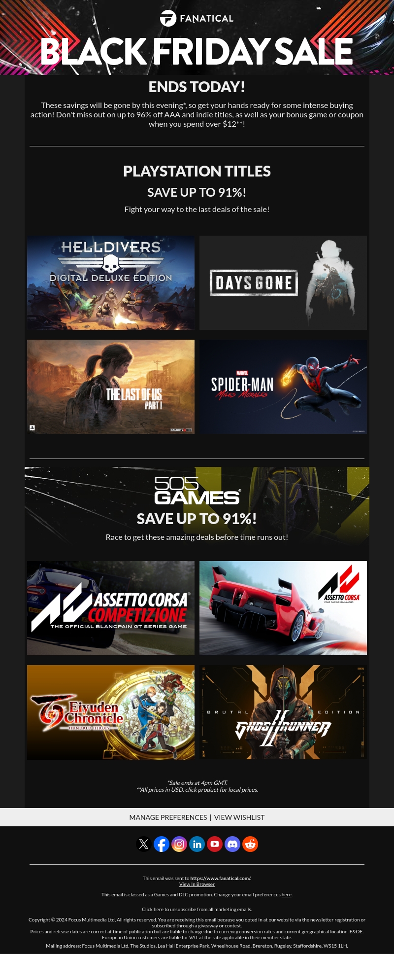 Mis de kans niet om te profiteren van de enorme kortingen tijdens de Black Friday Sale. Bespaar tot wel 96% op AAA en indie titels. Deze aanbieding eindigt vanavond, dus zorg dat je erbij bent. Ontvang een bonusgame of coupon bij een besteding van meer dan $12. Onthoud, de sale eindigt om 16:00 GMT. Alle prijzen zijn in USD.