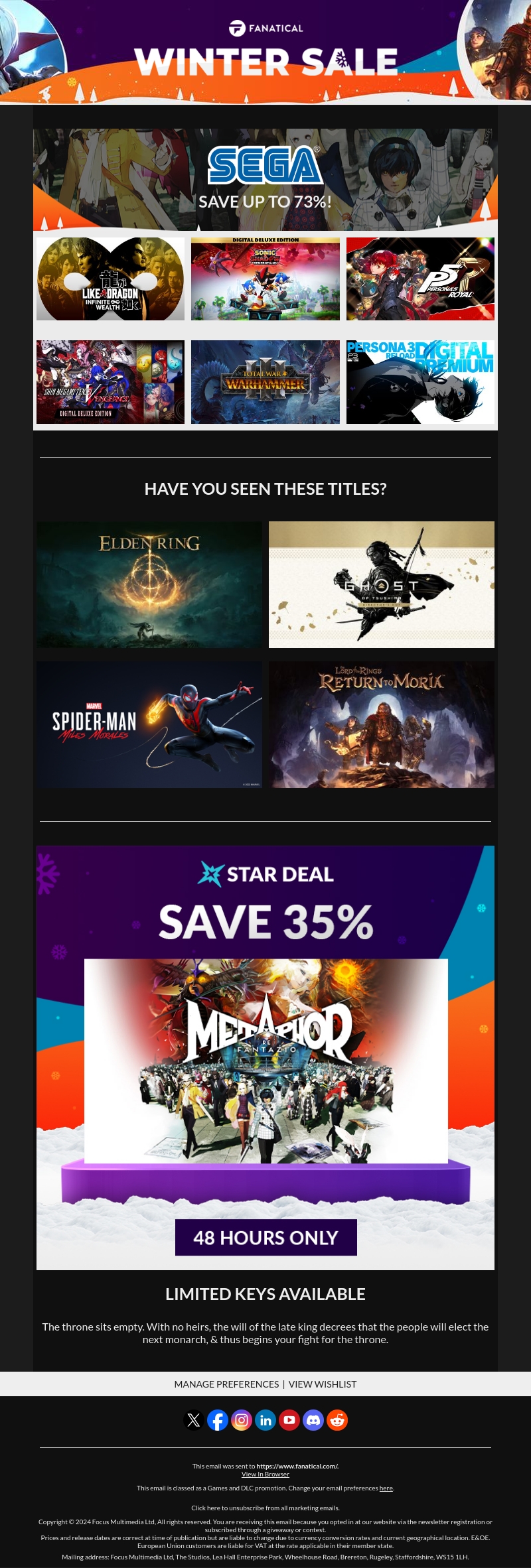 Beleef de beste SEGA aanbiedingen met kortingen tot wel 73%! Fanatical biedt een winteruitverkoop met topgames zoals Sonic, Persona en meer. Mis deze kans niet om je gamecollectie uit te breiden met geweldige titels. Duik in de beste actie en avontuur spellen. Zorg ervoor dat je profiteert van de Star Deal en bespaar 35% extra. Wees er snel bij, want er zijn beperkte sleutels beschikbaar!