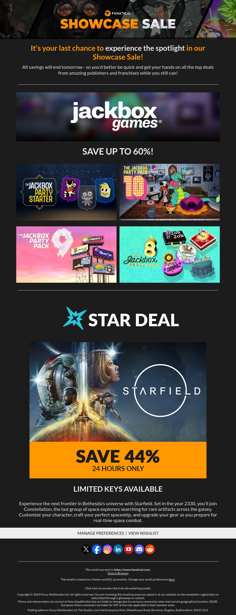 Het is je laatste kans om te profiteren van de spectaculaire kortingen in onze Showcase Sale! Geniet van kortingen tot wel 60% op top titels zoals Jackbox Games en meer. De tijd dringt, dus zorg dat je er snel bij bent. Dit is een unieke kans die je niet mag missen. Duik in de wereld van spannende deals en beleef je favoriete games opnieuw. Wees snel voordat de actie eindigt!