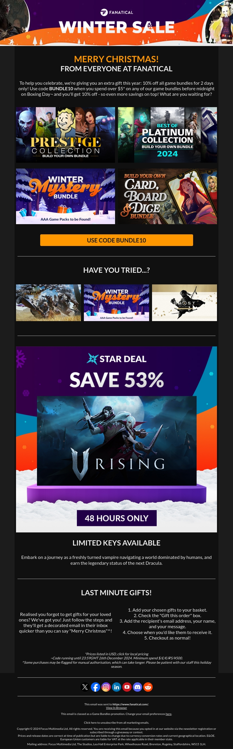 Vier de Winter Sale met Fanatical en ontvang 10% korting op alle gamebundels wanneer je de code BUNDLE10 gebruikt. Deze aanbieding is slechts 48 uur geldig. Ontdek de Prestige, Platinum en Mystery bundels voor geweldige besparingen. Vergeet ook niet de unieke Star Deal met 53% korting op V Rising, maar wees er snel bij, want de voorraad is beperkt. Mis deze kans niet om jouw favoriete games te scoren!