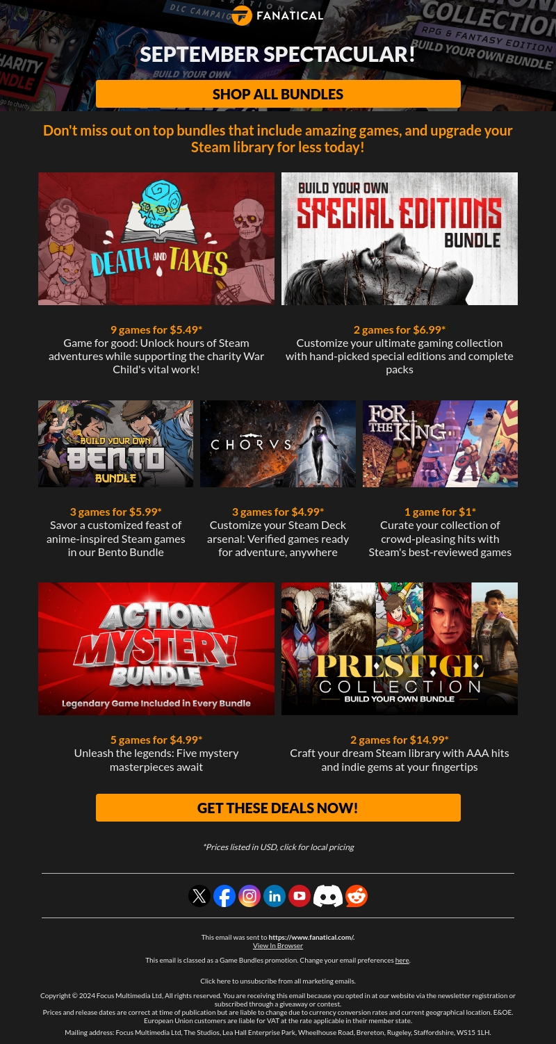 Mis de kans niet op fantastische spelbundels en breid je Steam-bibliotheek uit tegen spectaculaire prijzen. In deze aanbieding vinden gamers verschillende bundels zoals de 'Death and Taxes' voor slechts $5.49 of bouw je eigen unieke bundels met speciale edities. Profiteer van aanbiedingen die je smaak en voorkeuren vastleggen, met prijzen vanaf $1.