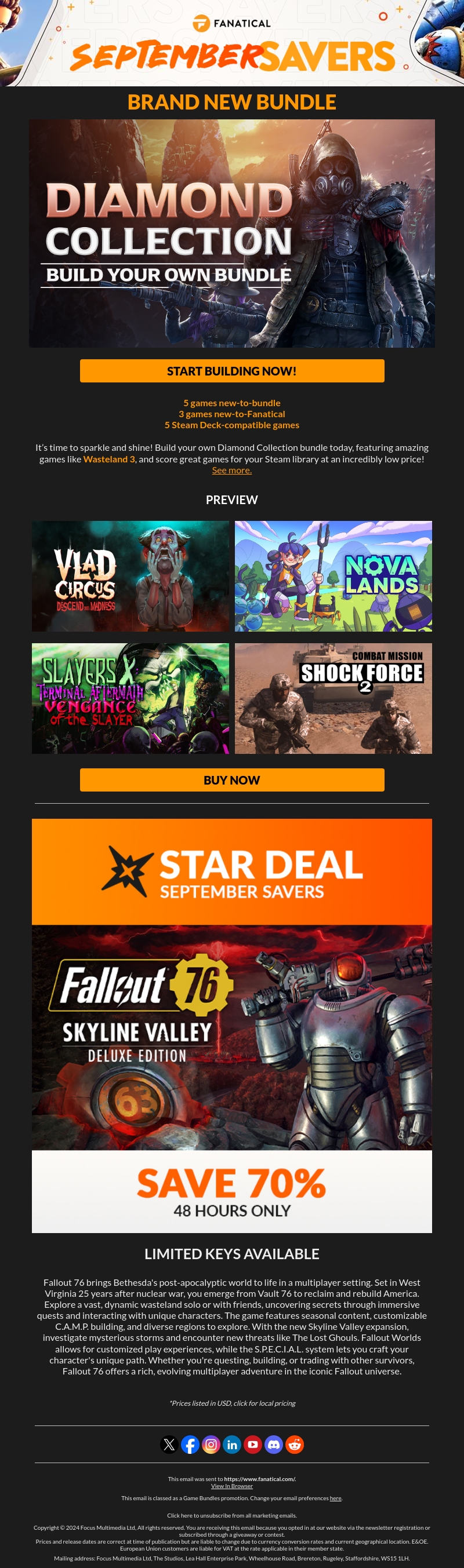 Begin met bouwen aan je eigen bundel met de nieuwe Diamond Collectie. Ontvang geweldige games zoals Wasteland 3 en meer. Deze unieke kans biedt ook een speciale deal op Fallout 76 met 79% korting!