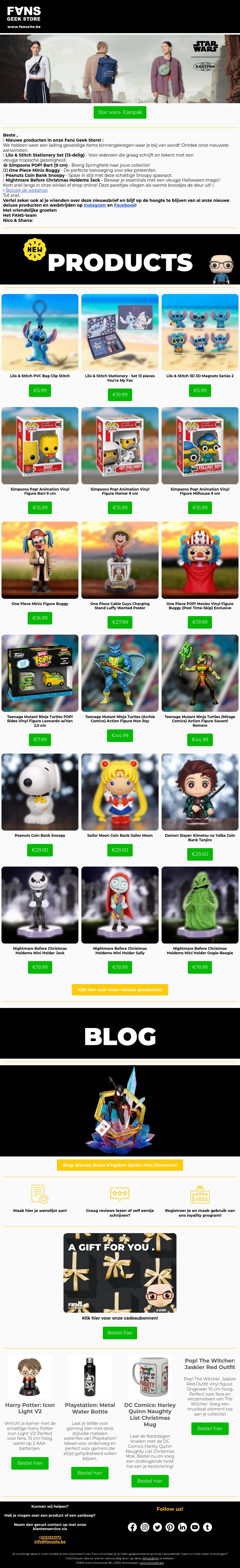 Er zijn nieuwe collecties gearriveerd op onze geek store! Ontdek de nieuwste producten van Lilo & Stitch, The Simpsons en One Piece. Of je nu een verzamelaar bent of op zoek naar een leuk cadeau, wij hebben voor iedereen wat wils. Mis het niet en bezoek onze winkel online.