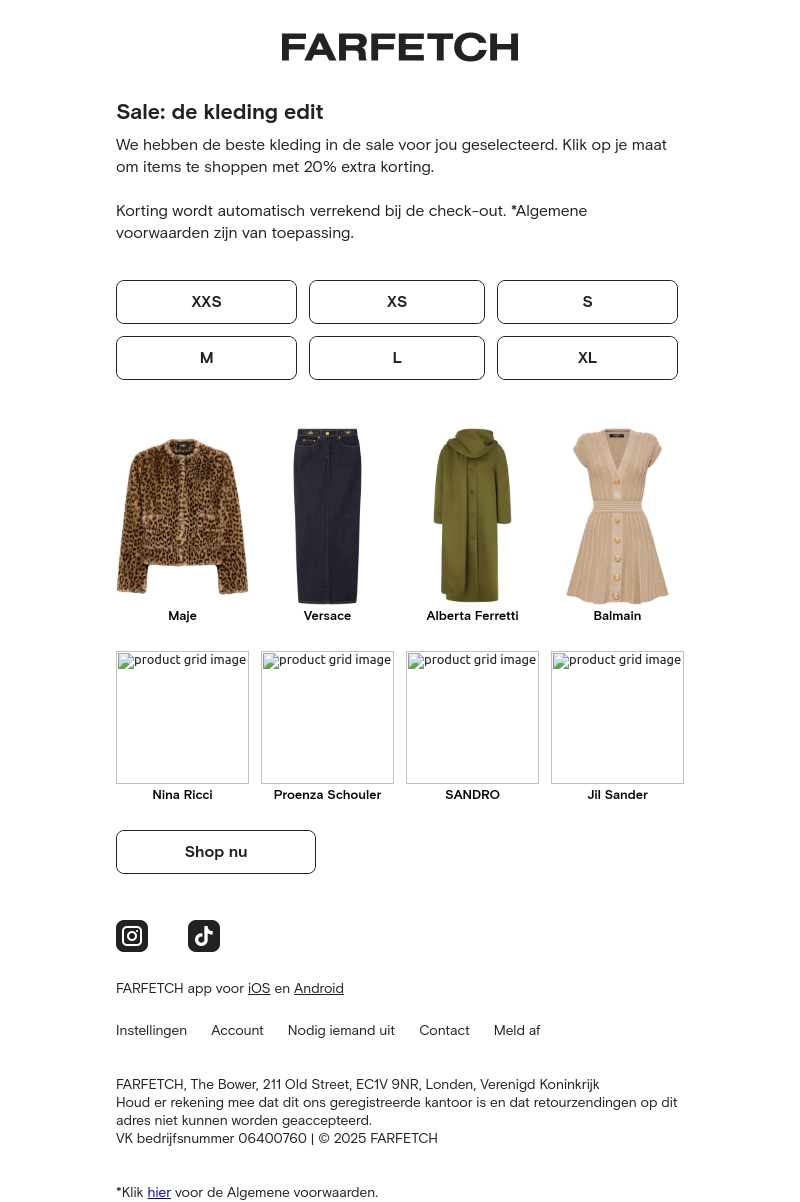 Duik in de ultieme kleding edit van Farfetch met een exclusieve extra korting van 20%. Geniet van de beste mode van merken als Maje, Versace en Balmain. Kies je maat en voeg stijl toe aan je garderobe. De korting wordt automatisch toegepast bij het afrekenen. Mis deze kans niet om stijlvol te besparen!