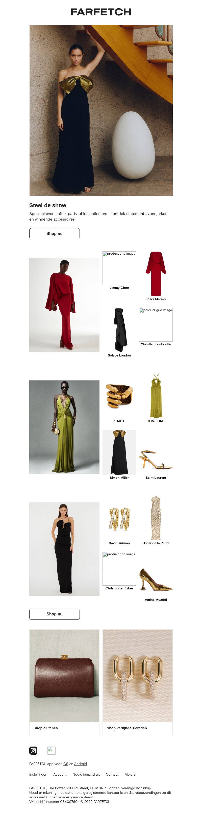Deze nieuwsbrief van Farfetch highlights de meest prestigieuze avondjurken en accessoires voor speciale gelegenheden. Ontdek de zorgvuldige selectie van topmerken zoals Tom Ford en Jimmy Choo. Of u nu naar een gala of een chic diner gaat, deze collectie zorgt ervoor dat u schittert. Voeg een vleugje elegantie toe met verfijnde sieraden en clutches. Maak van elke gelegenheid een statement met Farfetch's unieke stijlen.