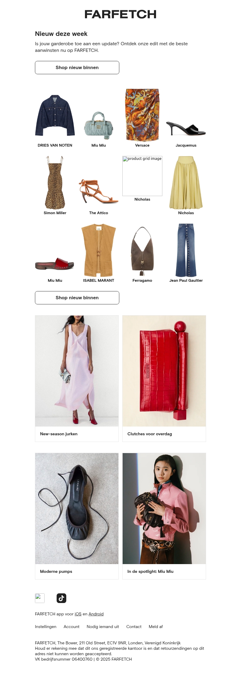 Is je garderobe toe aan een update? FARFETCH presenteert de nieuwste stijlen en designs van topmerken zoals DRIES VAN NOTEN, Miu Miu, Versace en meer. Of je nu op zoek bent naar stijlvolle jurken, opvallende clutches of moderne pumps, hier vind je de beste aanwinsten. Dompel je onder in de wereld van luxe mode en ontdek de trends die jouw look compleet maken.