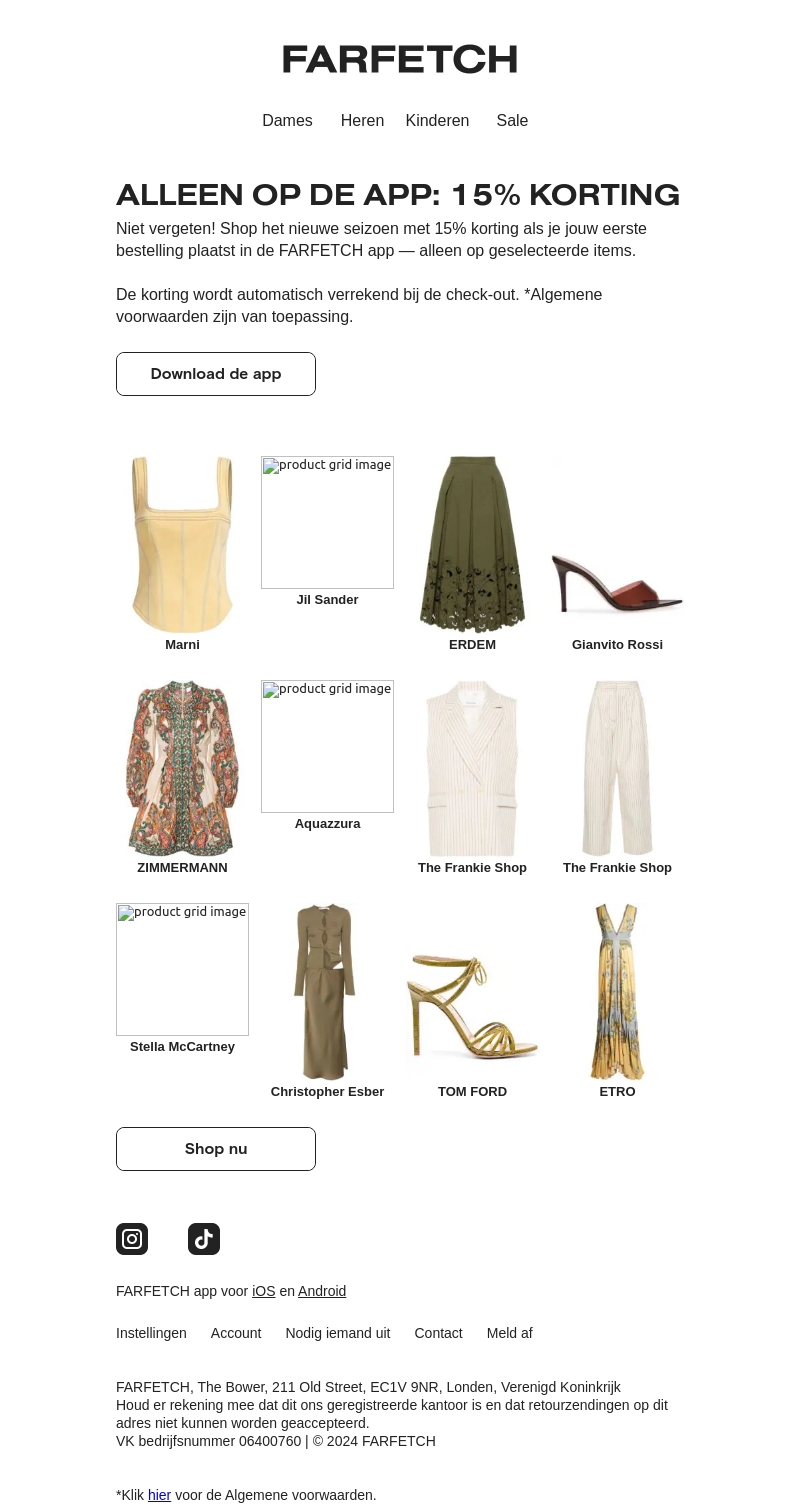 Niet vergeten! Shop het nieuwe seizoen met 15% korting als je jouw eerste bestelling plaatst in de FARFETCH app. De korting wordt automatisch verrekend bij de check-out op geselecteerde items.