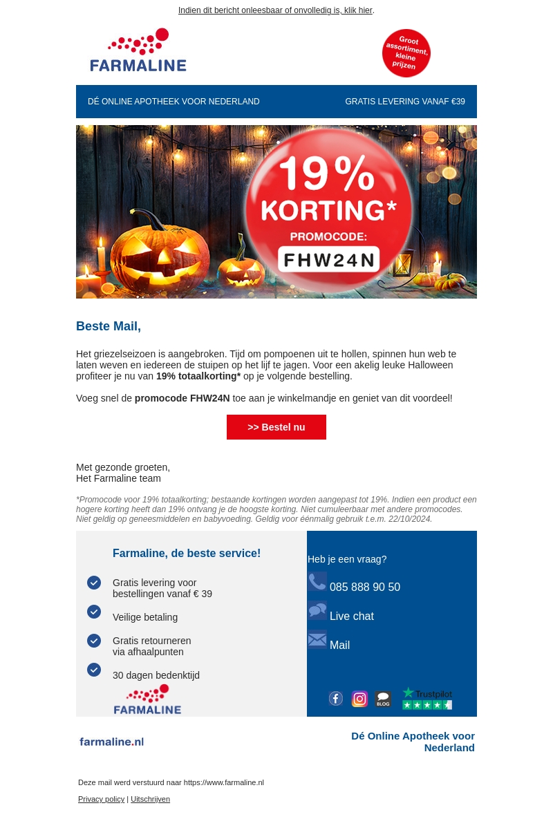 Het griezelseizoen is aangebroken en Farmaline viert Halloween met een speciale 19% kortingsactie. Gebruik de promotiecode FHW24N voor uw volgende aankoop en geniet van kortingen op een breed assortiment. De aanbieding is geldig tot en met 22 oktober 2024. Mis deze kans niet om uw favoriete producten voordelig aan te schaffen. Bestellen is eenvoudig met gratis levering vanaf €39.