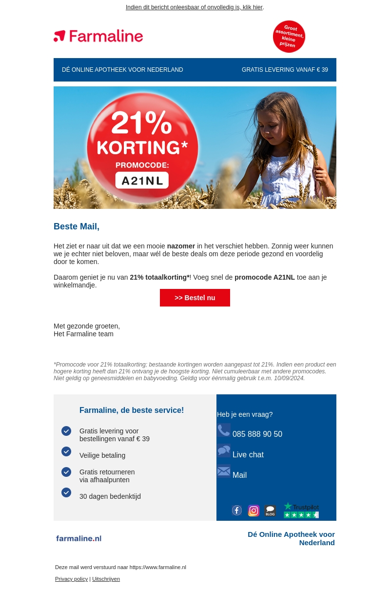 Beste Mail, het ziet er naar uit dat we een mooie nazomer in het verschiet hebben. Zonnig weer kunnen we je echter niet beloven, maar wél de beste deals om deze periode gezond en voordelig door te komen. Geniet nu van 21% totale korting met de promotiecode A21NL. Voeg deze snel toe aan je winkelmandje. Maak gebruik van gratis levering bij bestellingen vanaf €39 en profiteer van veilige betaling en gratis retourneren via afhaalpunten.