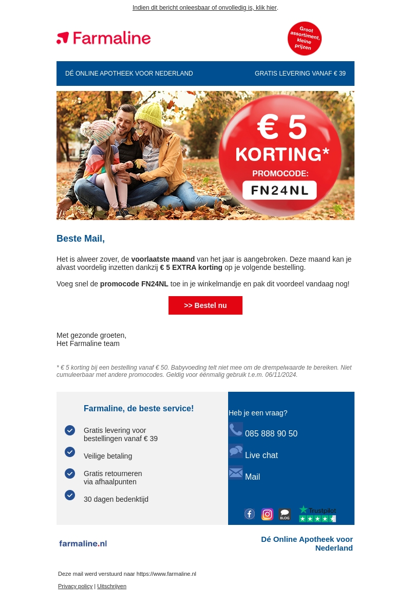 Farmaline biedt je nu een extra korting van €5 om de voorlaatste maand van het jaar voordelig te beginnen. Gebruik de promotiecode FN24NL bij je volgende bestelling. Het aanbod geldt voor eenmalig gebruik tot 6 november 2024. Mis deze kans niet om voordelig te shoppen bij de online apotheek van Nederland!