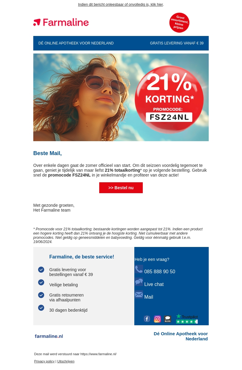 De zomer staat voor de deur en Farmaline heeft een geweldige aanbieding voor jou! Profiteer nu van 21% korting op je volgende bestelling met de promotiecode FSZ24NL. Gratis levering vanaf €39 en veilig betalen.