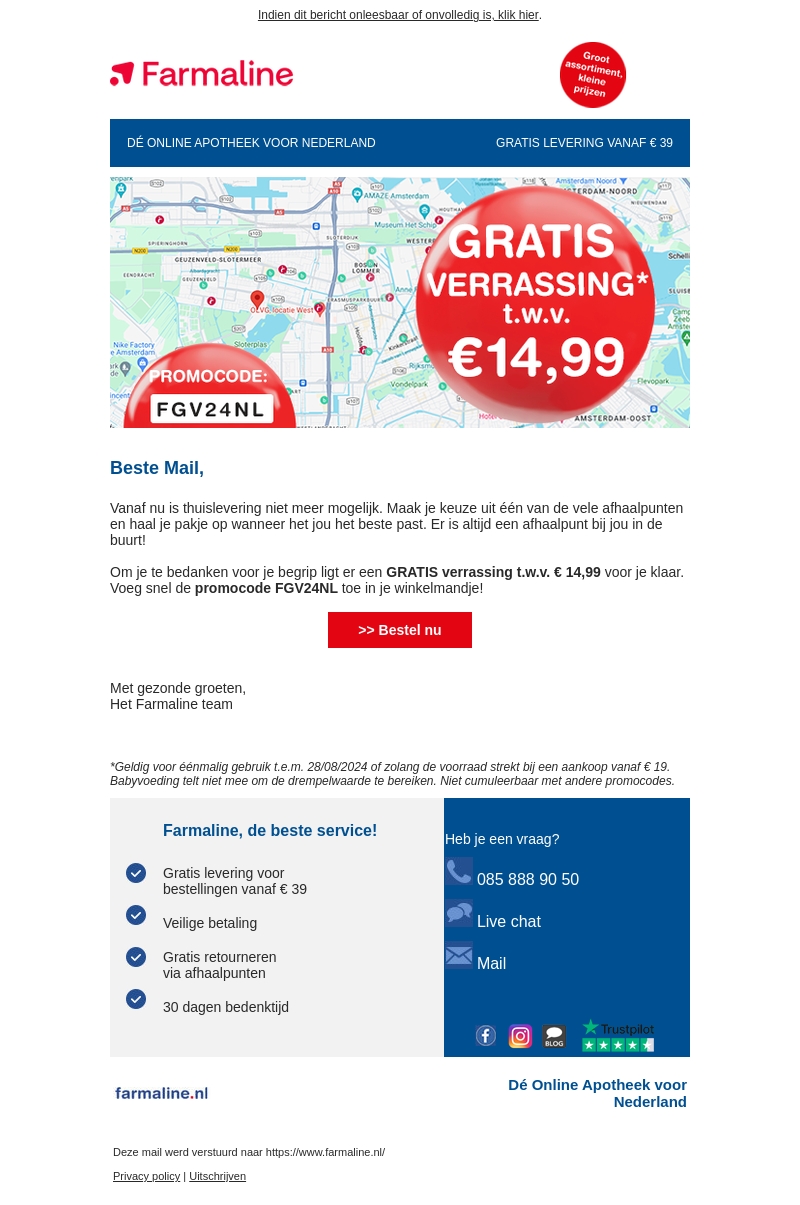 Beste Mail, thuislevering is niet langer een optie. Kies een van de vele afhaalpunten en haal je pakketje op wanneer het jou het beste uitkomt. Altijd een afhaalpunt bij jou in de buurt! Voeg de promocode FGV24NL toe voor een gratis verrassing van €14,99.