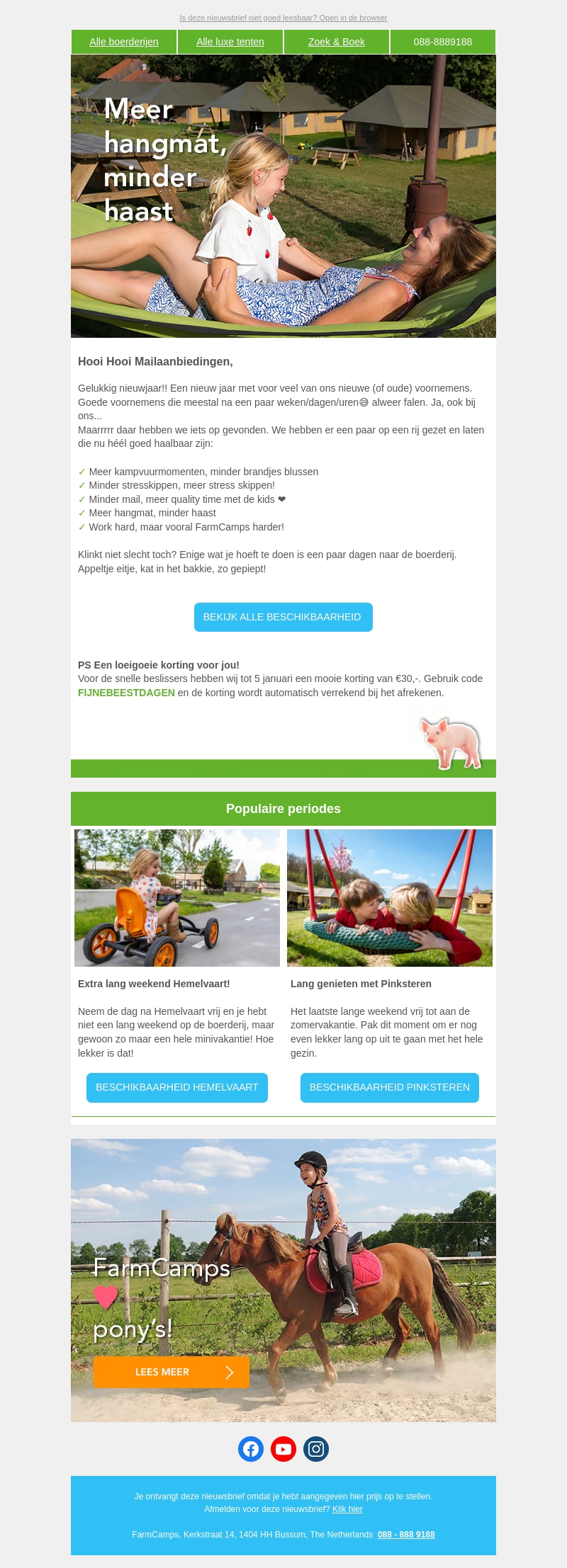Begin het nieuwe jaar met goede voornemens en geniet van meer quality time met je gezin. Verminder stress en ervaar meer ontspannen momenten bij FarmCamps. Boek nu en maak gebruik van een speciale korting! Bekijk de beschikbaarheid van populaire periodes zoals Hemelvaart en Pinksteren voor een geweldige ervaring.