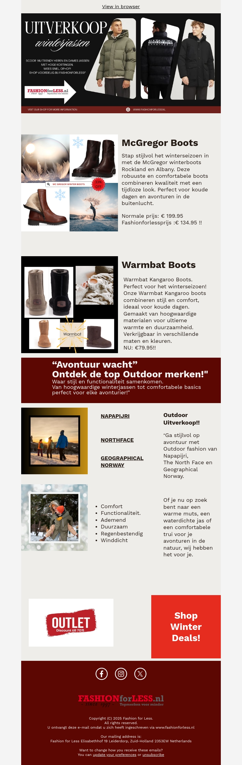Beleef het winterseizoen met stijl dankzij onze grote uitverkoop. Shop hoge kortingen op trendy heren- en damesjassen bij Fashionforless. Ontdek ook stijlvolle en comfortabele boots van McGregor en Warmbat. Perfect voor koude dagen en avonturen buiten. Ga op avontuur met toonaangevende outdoor merken als Napapijri, The North Face, en Geographical Norway.