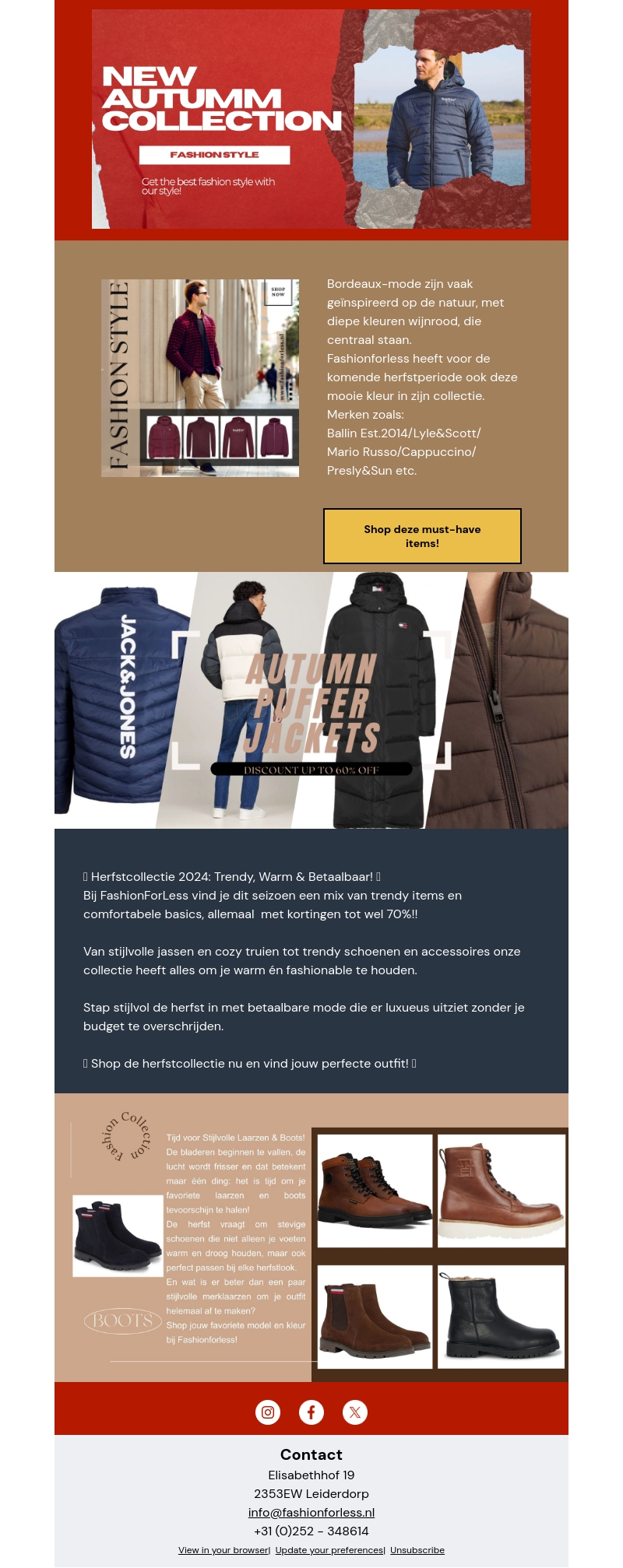 Bereid je voor op de koude dagen met de nieuwste herfsttrends van FashionForLess. Ontdek een uitgebreide collectie van stijlvolle jassen en schoenen in warme tinten, ideaal voor de herfst. Geniet van comfortabele basics en trendy items met kortingen tot 70%! Mis deze kans niet om je garderobe te vernieuwen en shop de nieuwste collecties vandaag nog.