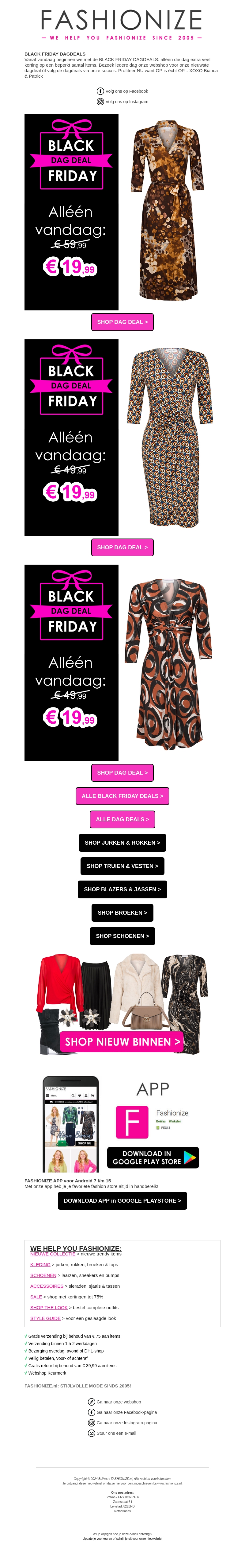 Beleef de spanning van Black Friday met de exclusieve dagdeals van Fashionize. Profiteer van prachtige jurken, rokken, en meer voor slechts €19,99 per stuk. Deze aanbiedingen zijn alleen vandaag geldig, dus sla je slag terwijl de voorraad strekt. Vind de perfecte outfit met geweldige kortingen. Shop eenvoudig online en ontdek onze nieuwste collectie.