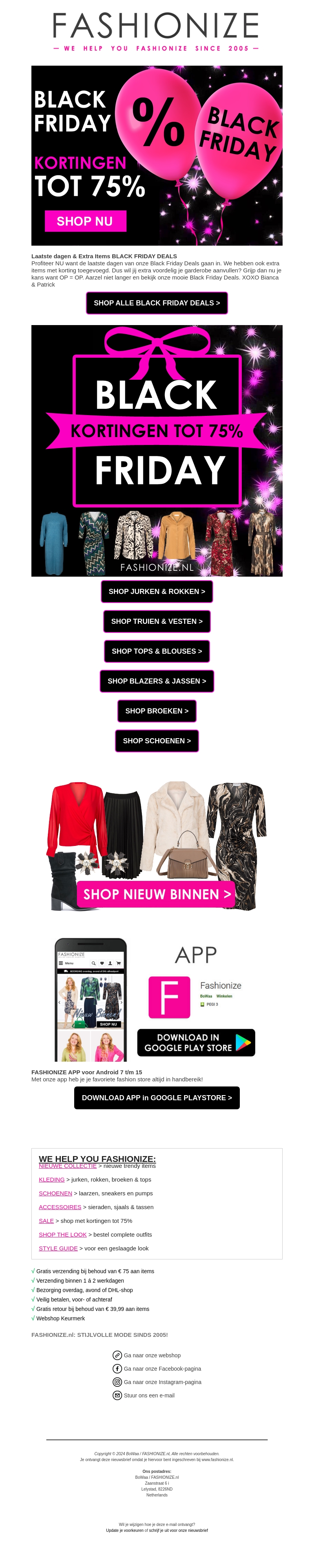 Grijp je kans met de mega Black Friday deals van Fashionize! Geniet van kortingen tot 75% op een breed assortiment kleding en accessoires. Profiteer van gratis verzending bij bestellingen vanaf €75 en ontdek ook onze handige mobiele app. Shop nu en sla je slag voordat het te laat is!