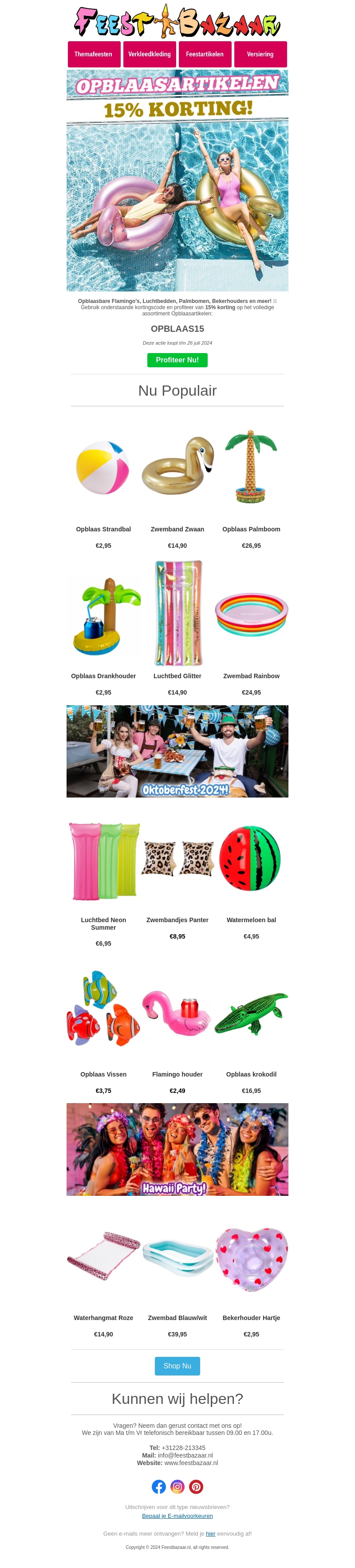 Zomer is in volle gang en wij hebben de leukste opblaasartikelen voor je klaarstaan! Van opblaasbare flamingo's en luchtbedden tot palmboom bekerhouders. Profiteer nu van 15% korting op ons volledige assortiment. Deze actie loopt tot 19 juli 2024. Shop nu en maak je zomer compleet!