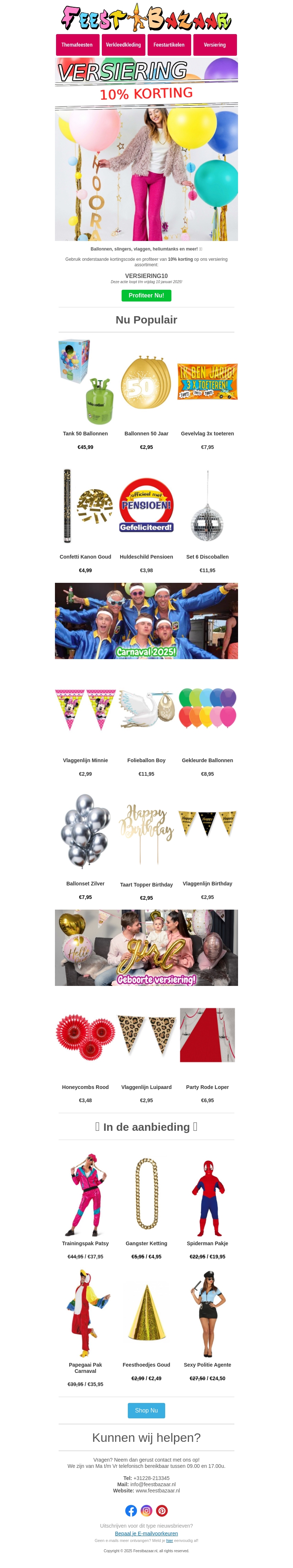Bereid je voor op een knallend feest met onze nieuwste feestartikelen! Profiteer van 10% korting op versieringen en ontdek populaire items zoals ballonnen en confetti kanonnen. Hug de spotlight met onze opvallende carnavalskleding en accessoires. Wees er snel bij, want deze deals zijn tijdelijk. Gebruik de kortingscode om direct te besparen.