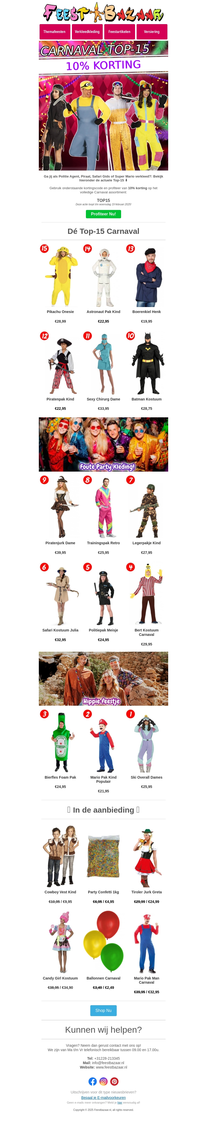 Ontdek de ultieme top-15 must have outfits voor Carnaval 2025! Of je nu in de huid wilt kruipen van een superheld of een feestelijke retrolook zoekt, onze selectie heeft iets voor iedereen. Profiteer van een speciale 10% korting op al je aankopen. Van Pikachu-onesies tot piratenpakjes, style je Carnaval precies zoals jij wilt. Bezoek onze site voor meer details en nog meer inspiratie.