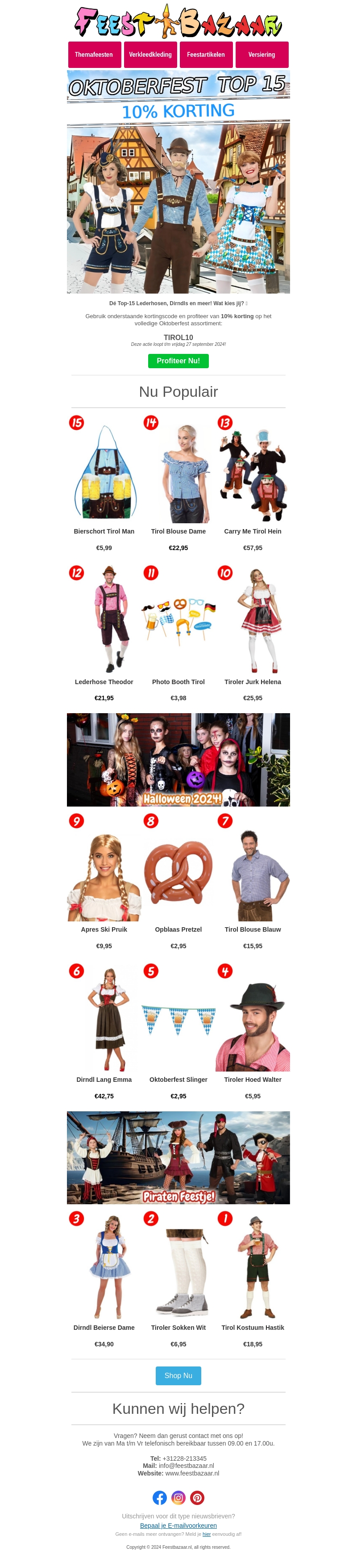 Vier Oktoberfest in stijl met de top-15 must haves! Van Lederhosen tot Dirndls, ontdek alles wat je nodig hebt voor een geslaagd feest. Ontvang 10% korting op je aankoop met de kortingscode 'TIROL10'.