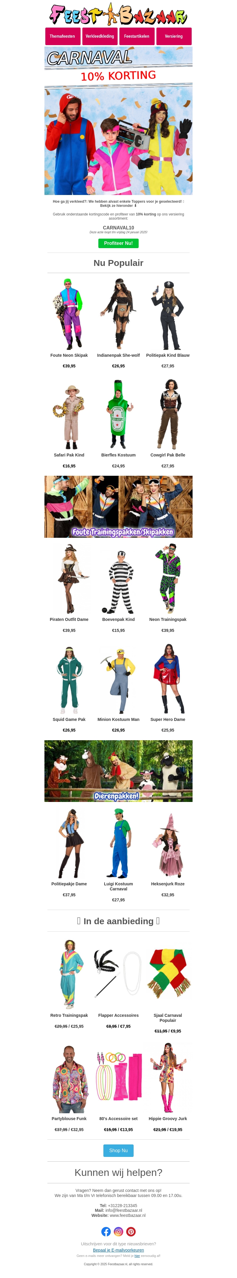 Bij Feestbazaar bereid je je optimaal voor op carnaval met de nieuwste kostuums en accessoires. Profiteer nu van een exclusieve korting van 10% op onze carnaval collectie. Van neon skipakken tot superhelden kostuums, er is voor ieder wat wils. Laat je inspireren door onze populaire keuzes en special deals. Mis deze kans niet om je carnaval nog feestelijker te maken.