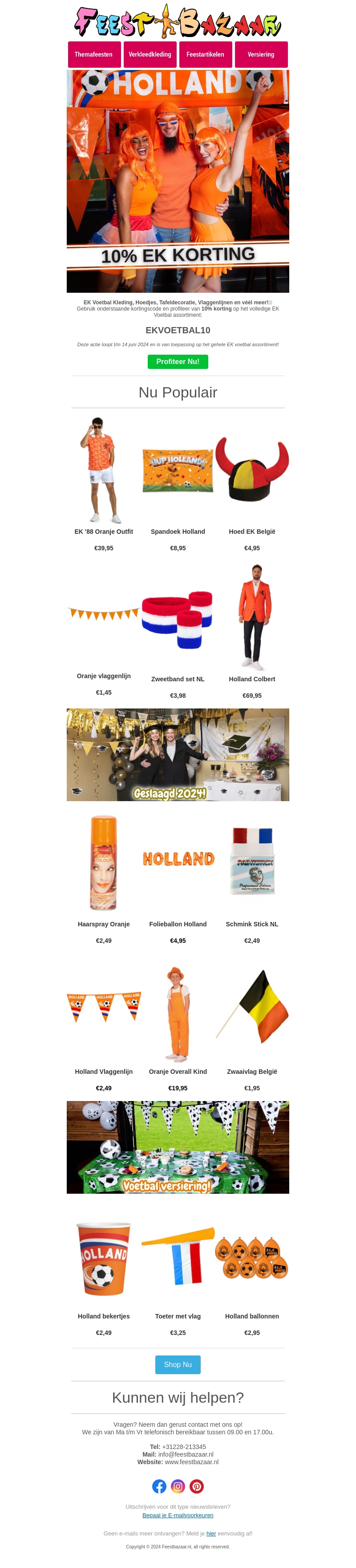 Bereid je voor op het EK Voetbal met de leukste artikelen van Feestbazaar. Scoor nu te gekke kleding, decoratie en accessoires. Profiteer van 10% EK korting met code EKVOETBAL10. Actie geldig tot 14 juni 2024.
