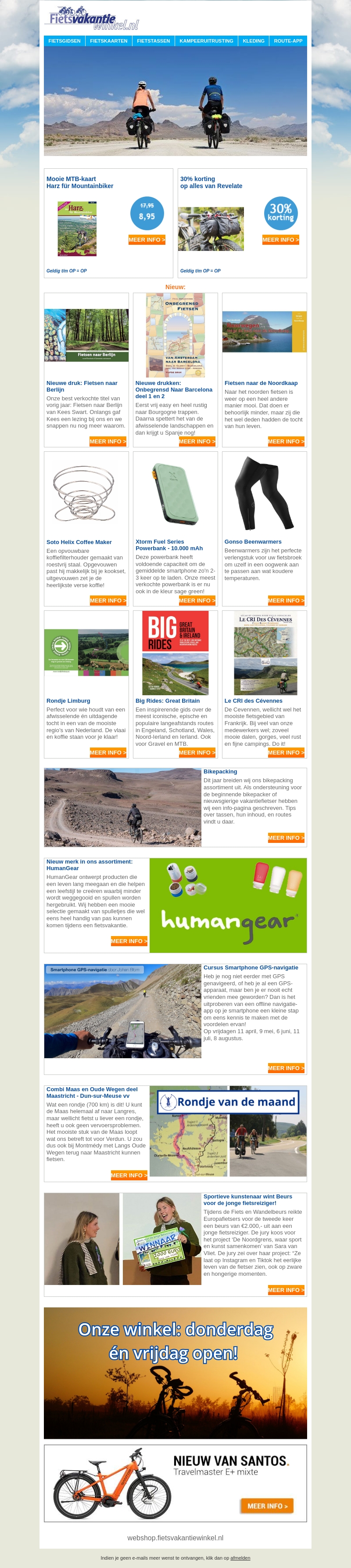 In de Fietsvakantiewinkel nieuwsbrief van maart vindt u de nieuwste aanbiedingen op fietsgidsen, accessoires en meer. Ontvang 30% korting op alles van Revelate en ontdek nieuwe producten zoals de Xstorm Powerbank. Verken unieke bestemmingen met onze gidsen en plan uw volgende fietsvakantie. Bezoek onze winkel, nu ook open op vrijdag.