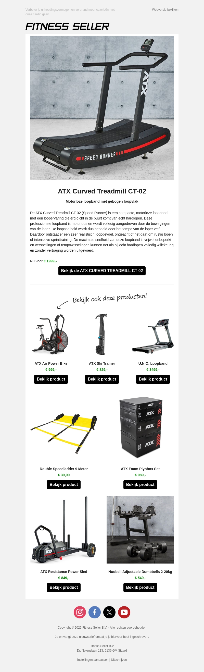 Maak kennis met onze topklasse cardiotoestellen zoals de ATX Curved Treadmill. Ontworpen voor een realistische loopervaring zonder motor. Profiteer van maximale snelheid en nauwkeurigheid, perfect voor intensieve sprinttrainingen. Bekijk ook andere geweldige producten zoals de ATX Air Power Bike en de Nuobell Adjustable Dumbbells.