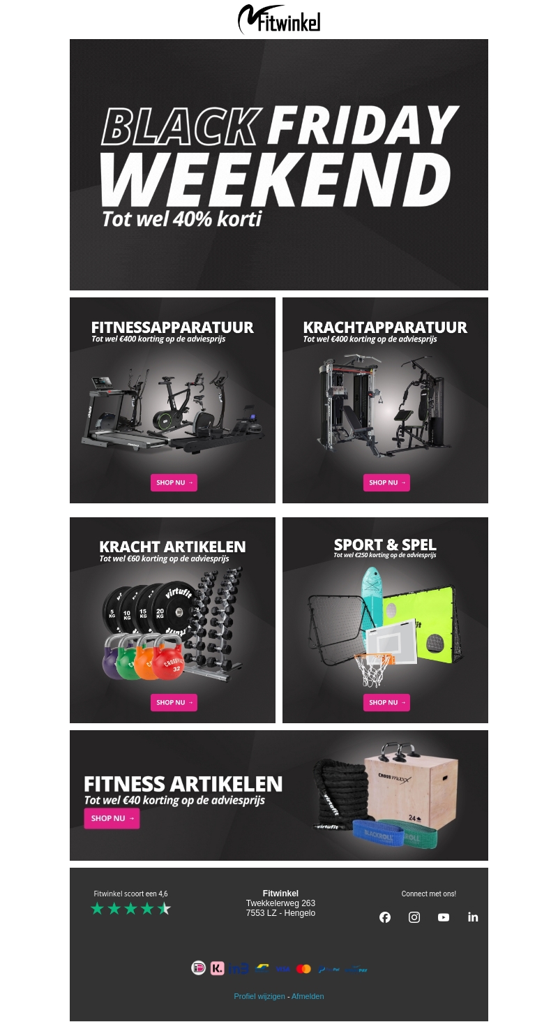 Beleef het ultieme Black Friday winkelplezier bij Fitwinkel! Ontdek ongelooflijke kortingen oplopend tot 40% op een breed scala aan fitnessapparatuur en accessoires. Dit weekend is de perfecte gelegenheid om uw thuisgym in te richten met apparatuur zoals krachtartikelen, sport- en spelartikelen. Mis deze kans niet en shop nu voor de beste deals en besparingen. Elke aankoop komt met een hoog klanttevredenheidscijfer van 4,6. Bezoek ons in Hengelo of online voor meer informatie.