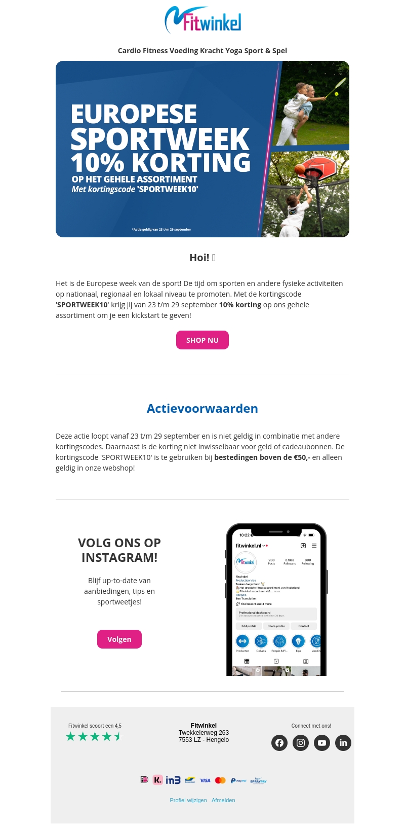 Het is de Europese Sportweek bij Fitwinkel! Van 23 tot en met 29 september ontvang je 10% korting op het gehele assortiment. Gebruik de kortingscode SPORTWEEK10 bij je bestelling en profiteer van deze geweldige actie. Shop voor al je sportbehoeften nu!