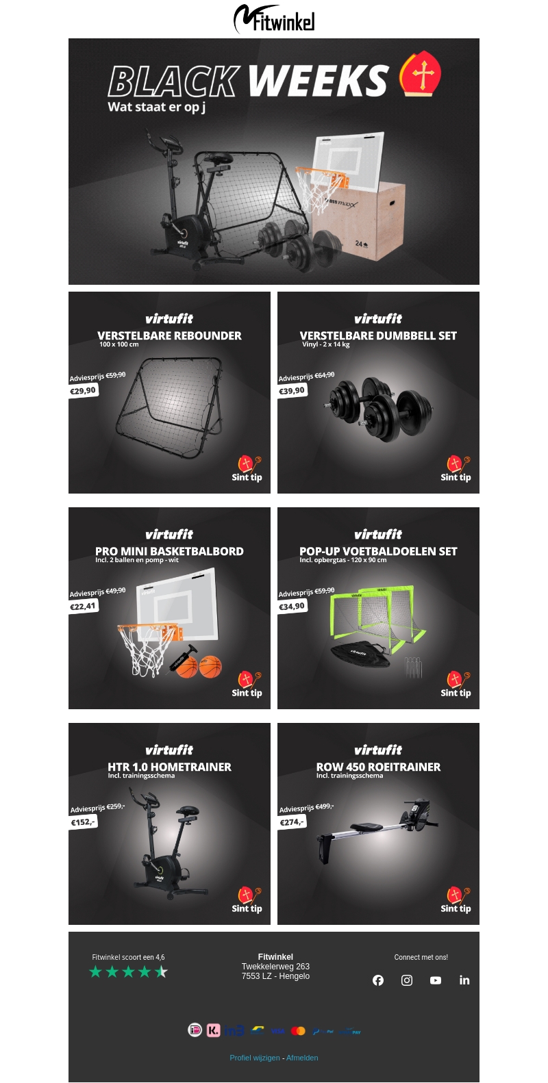 Fitwinkel presenteert zijn Black Weeks vol met spectaculaire kortingen op sportartikelen. Van verstelbare dumbbell sets tot professionele hometrainers, alles wat je nodig hebt om fit te blijven. Mis ook de Sint tips niet voor de feestdagen. Maak gebruik van fantastische prijzen en verrijk jouw sportuitrusting.