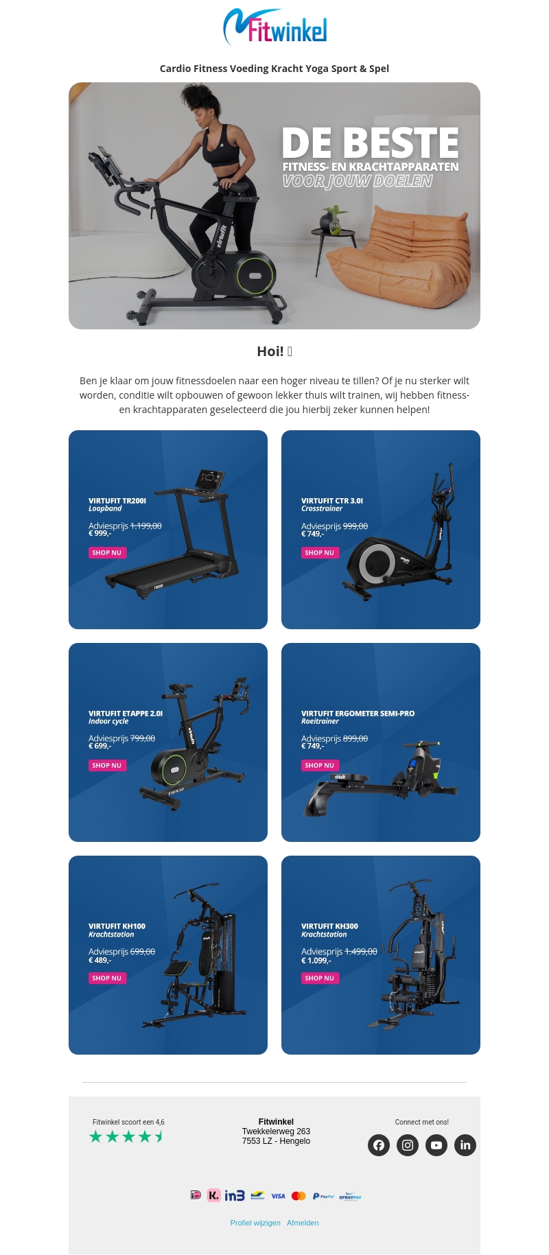 Bereid je voor om je fitnessdoelen te halen met onze hoogwaardige fitness- en krachtapparaten. Of je nu je kracht wilt vergroten, je conditie wilt opbouwen of gewoon thuis wilt trainen, wij hebben de juiste apparatuur voor jou. Profiteer van geweldige aanbiedingen op loopbanden, crosstrainers, indoor cycles en krachtstations.