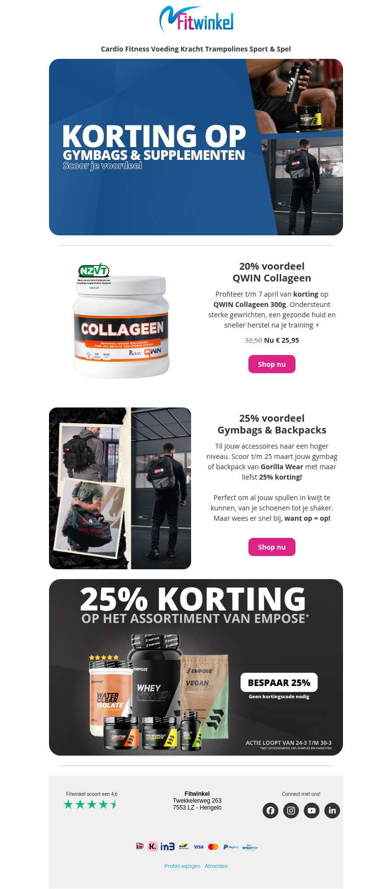 Profiteer van geweldige kortingen op QWIN collageensupplementen en Gorilla Wear gymbags bij Fitwinkel. Ondersteun je training en stijl met kortingen tot 25%! Wees snel, de aanbiedingen zijn beperkt.