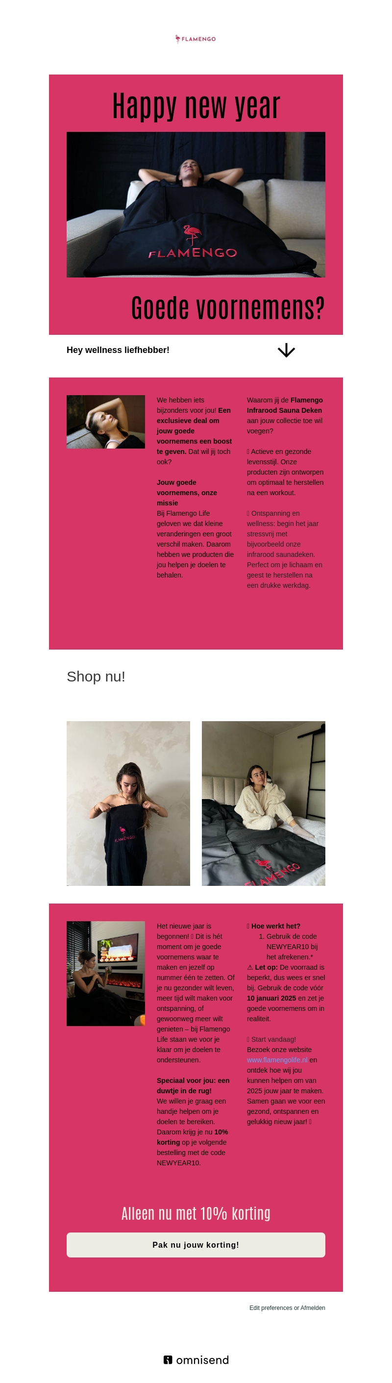 Begin het nieuwe jaar met een exclusieve aanbieding van Flamengo. Ontvang 10% korting op je volgende bestelling, speciaal voor jouw goede voornemens. Verwen jezelf met onze infrarood sauna deken voor een gezonde en ontspannende levensstijl. Gebruik de code NEWYEAR10 bij het afrekenen. Wees snel, de voorraad is beperkt!