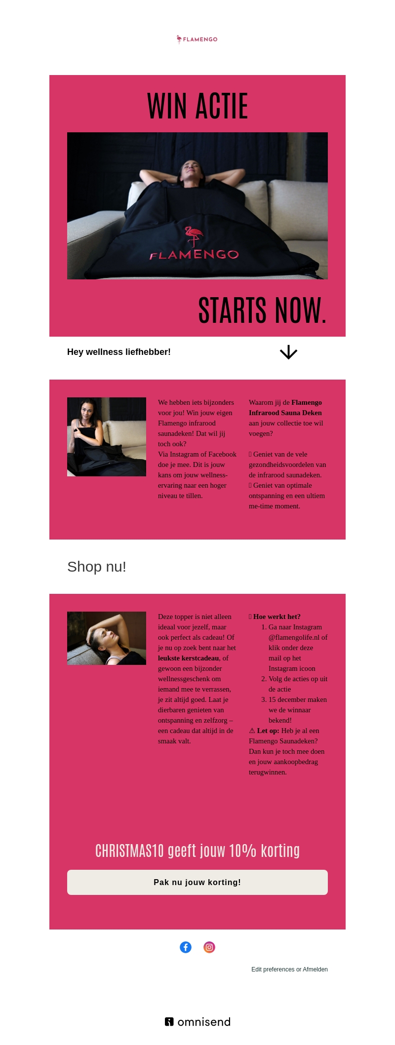 Maak nu kans op je eigen Flamengo infrarood saunadeken en til je wellnesservaring naar een hoger niveau. Doe mee via Instagram of Facebook. Geniet van gezondheidsvoordelen en ontspanning. Perfect als cadeau of voor zelfzorg.
