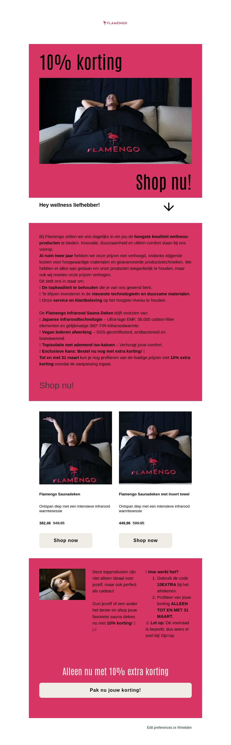 Gun jezelf de ultieme ontspanning met de Flamengo Saunadeken. Nu met 10% exclusieve korting, geniet je van de hoogste kwaliteit infrarood technologie. Ontdek de duurzame en luxe afwerking die zorgt voor maximaal comfort. Mis deze kans niet, want de aanbieding is slechts beperkt geldig.