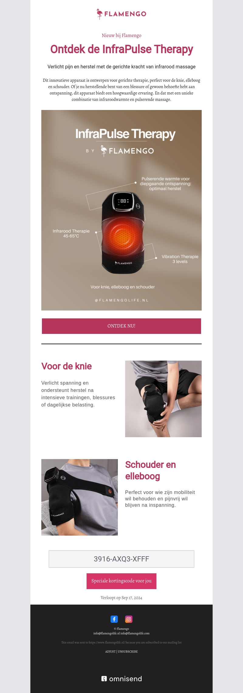 Nieuw bij Flamengo: de InfraPulse Therapie. Ontworpen voor gerichte therapie om pijn te verlichten en herstel te bevorderen met infrarood warmte en pulserende massage. Ideaal voor knie, elleboog en schouder. Ontdek de voordelen voor jouw welzijn. Speciale kortingscode binnenin!